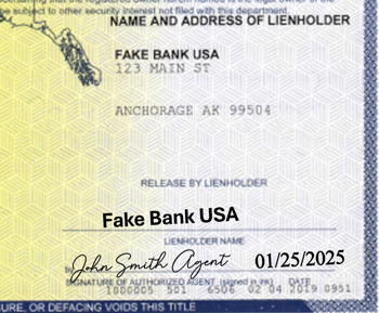 The lienholder cannot be the same person or organization listed as the registered owner on the title.