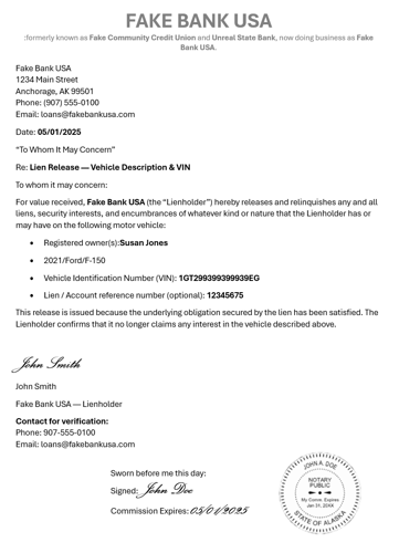 - Note: If the name of the organization has changed since the lien was first recorded (common among financial institutions) then a statement must be included in the letter listing that the releasing organization is one and the same as the one listed on the title.